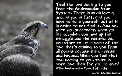 We love you so very much, and we invite you to feel the love coming to you from the Andromedan Star System. There is much love all around you in fact, and you have to tune yourself out of it in order to not feel it. And so, when you surrender, when you let go, when you give up the struggle and the resistance, you start to let in some of the love that’s coming to you from all points across the universe and beyond. When you feel that love coming to you, there is more love then for you to give. There is more of you to give. When you go outside of yourself looking for that love in other humans who are also feeling disconnected and separate from the love that is coming to them, you tend to come up short.